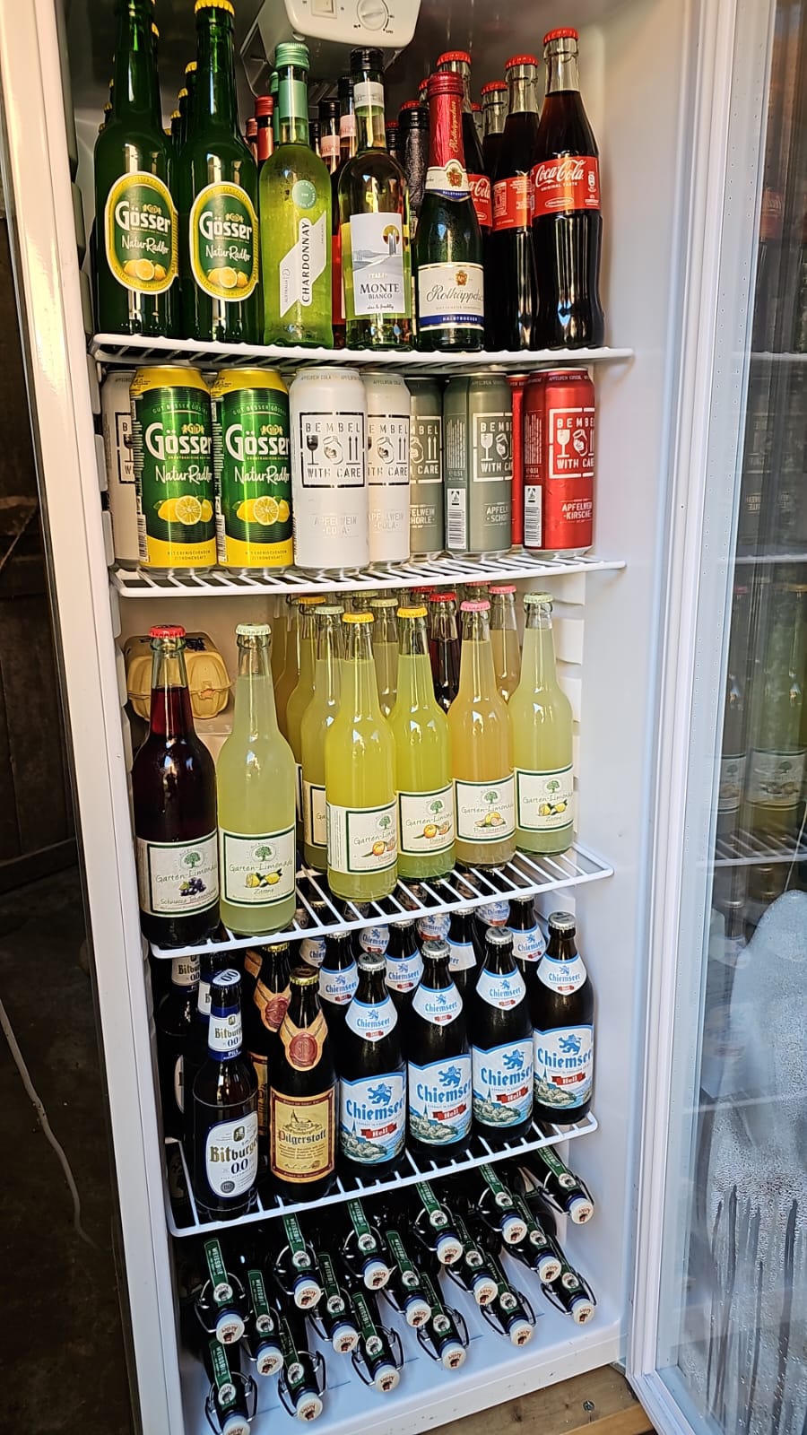 In unserem Getränkekühlschrank finden Sie eine kleine Auswahl an gekühlten Getränken zur Selbstbedienung – ideal für eine Erfrischung zwischendurch oder einen entspannten Abend auf der Terrasse.